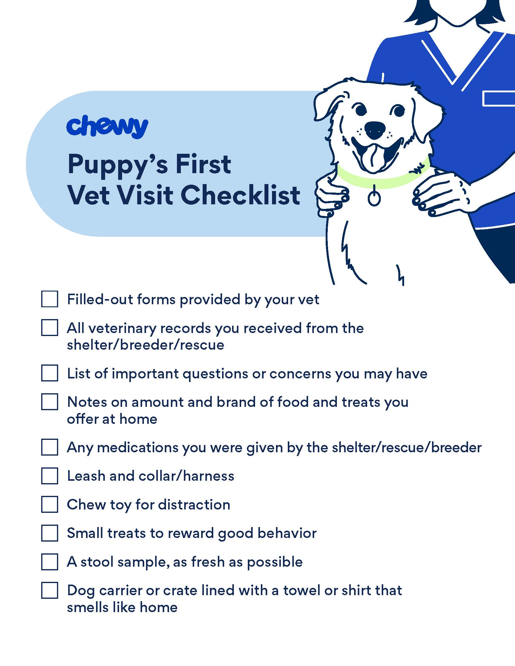 Puppy’s first trip to the vet can be overwhelming, for both the pet and the pet parent. To help you feel prepared and confident ahead of the appointment, work your way through this First Vet Visit Checklist.