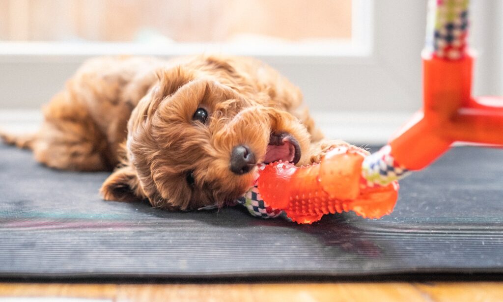 - Provide your pup with healthy chew toys appropriate for their size and age to help with the discomfort of teething.