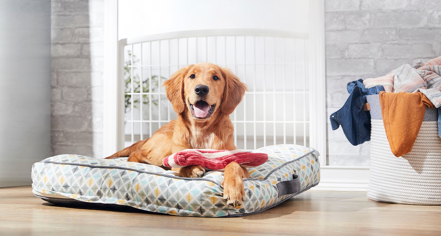 Place the crate in a quiet part of your house that isn’t too far removed from the action. (The garage or seldom-visited basement aren’t good options.) Then, cover the crate with a blanket that you’ve used a few times to surround your pooch with your scent. Place an extra-cozy bed inside that feels like a hug. If your dog still gnaws on contraband, make sure that nearby blankets or bedding can’t become chewing targets.