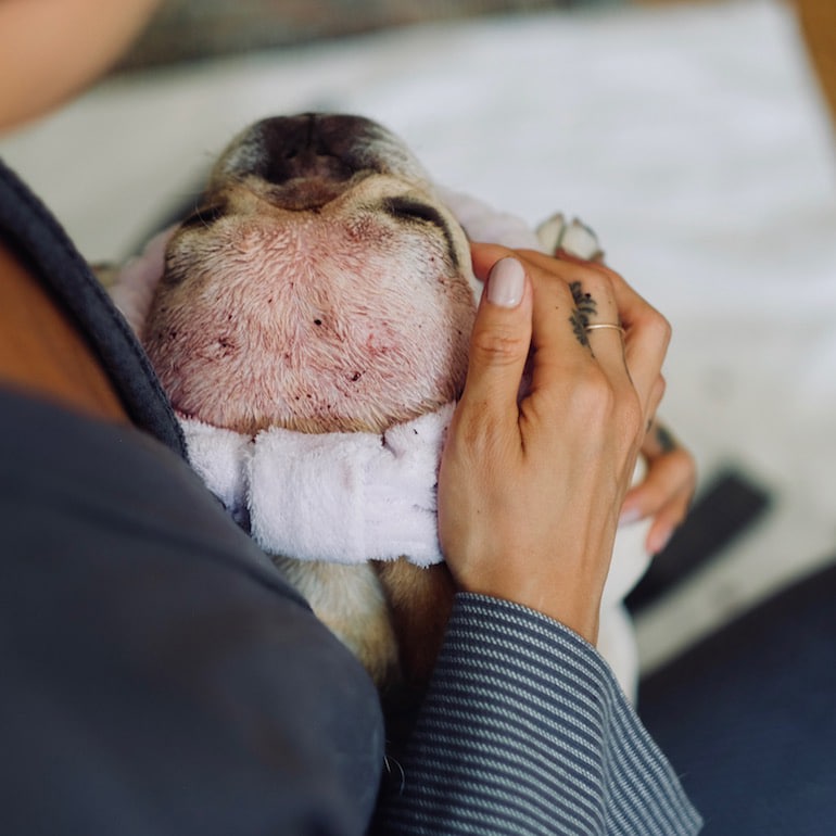 3. Apply and massage: When giving Fira her blueberry facial, I focused around her muzzle and eye fold area, taking care not to get it into her eyes. She actually has a small hot spot on her forehead, so I think this facial is going to be super gentle for those sensitive areas.