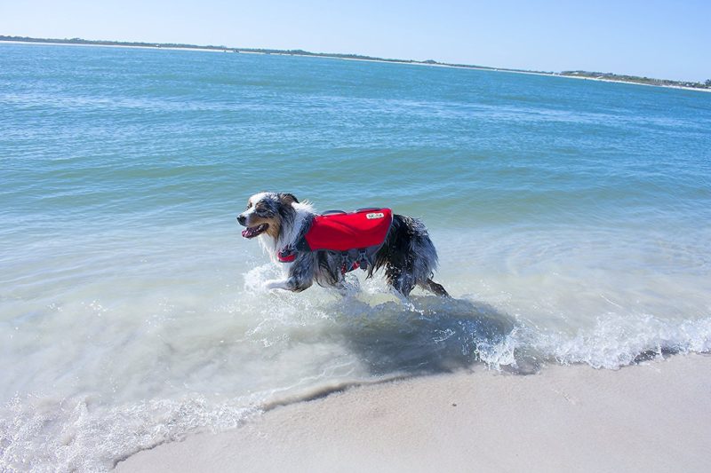 Outward Hound’s Neoprene Dawson Swimmer Dog Life Jacket is bright red so it’s easy to track your pup. It has a float front so they stay above water and comes in sizes XS–XL.