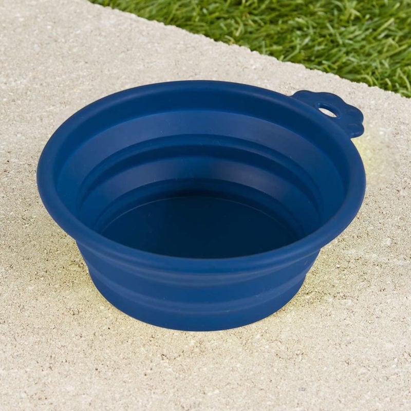 A portable dog travel bowl makes this easy. Many are collapsible for easier packing—like the Bonza Collapsible Silicone D