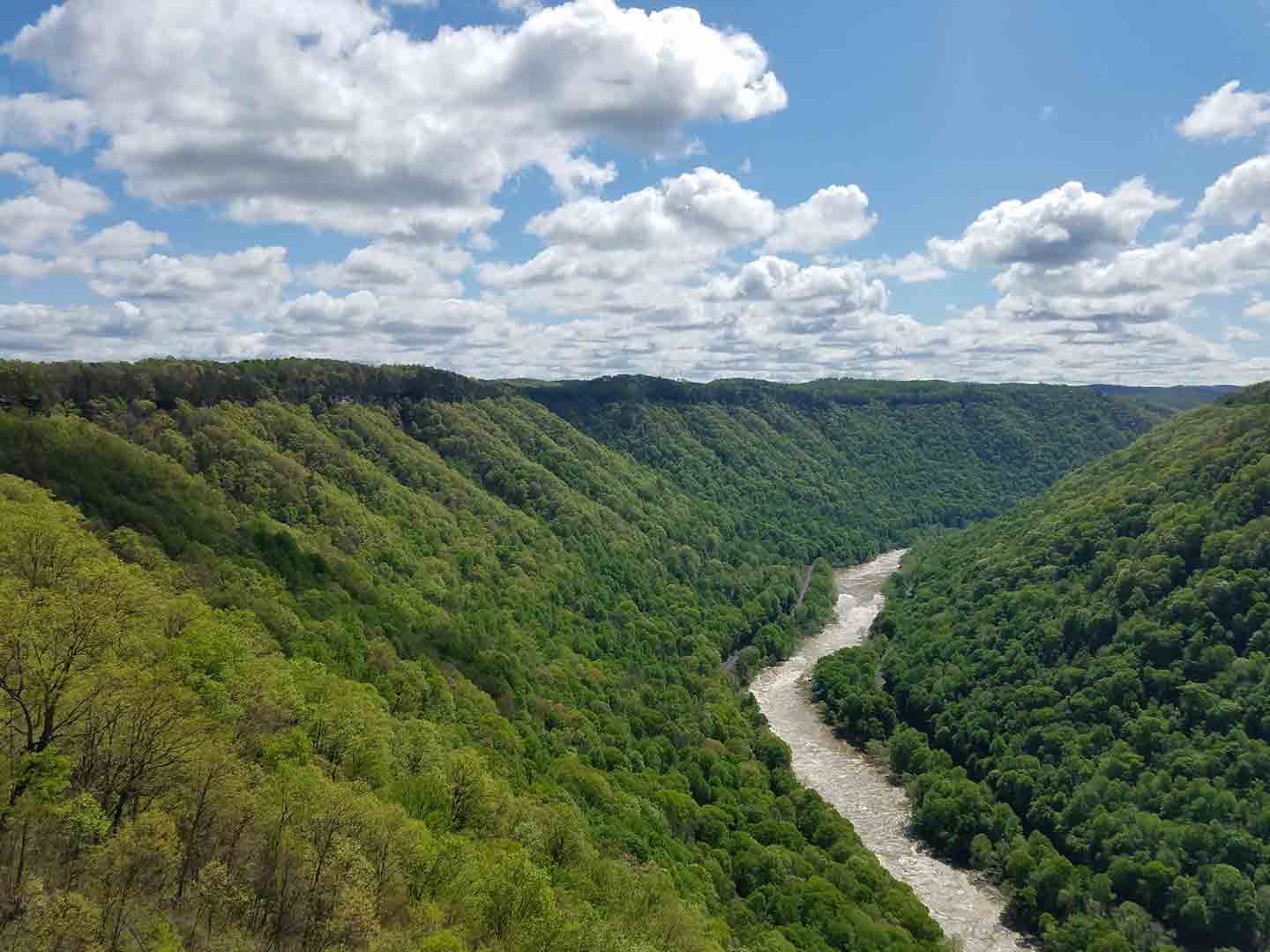 With its lush hemlock forests and stunning scenic overlooks, any hike along the Endless Wall Trail is sure to be a fan-favorite. Your pup can join you on this popular hike that lets you take in the beautiful scenery of New River Gorge—without any really steep sections to slow you down. The trail zig-zags along the cliff edge (use caution and keep your dog leashed) with plenty of scenic vistas including the outstanding view down to New River at Diamond Point. In the spring, the woodsy sections will be in bloom with rhododendron and mountain laurel.