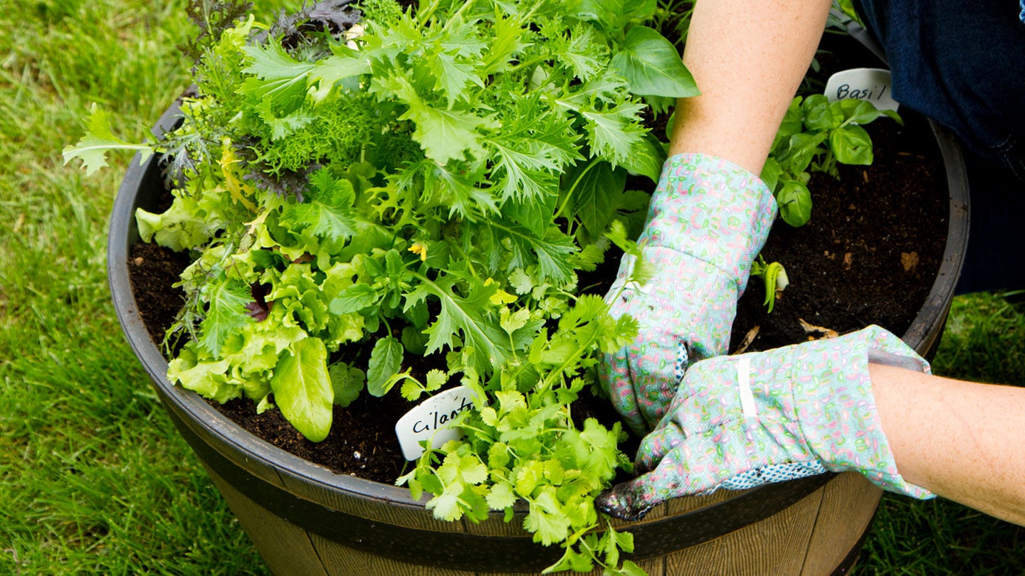 What do we mean by “large”? Bigger is better if you are planting an Instagram-worthy crop. A container that’s 24″ x 24″ in diameter with a depth of at least 18″ is what you’re looking for. Can’t find that? Look for a large half-barrel which can be found at most hardware stores and garden centers.