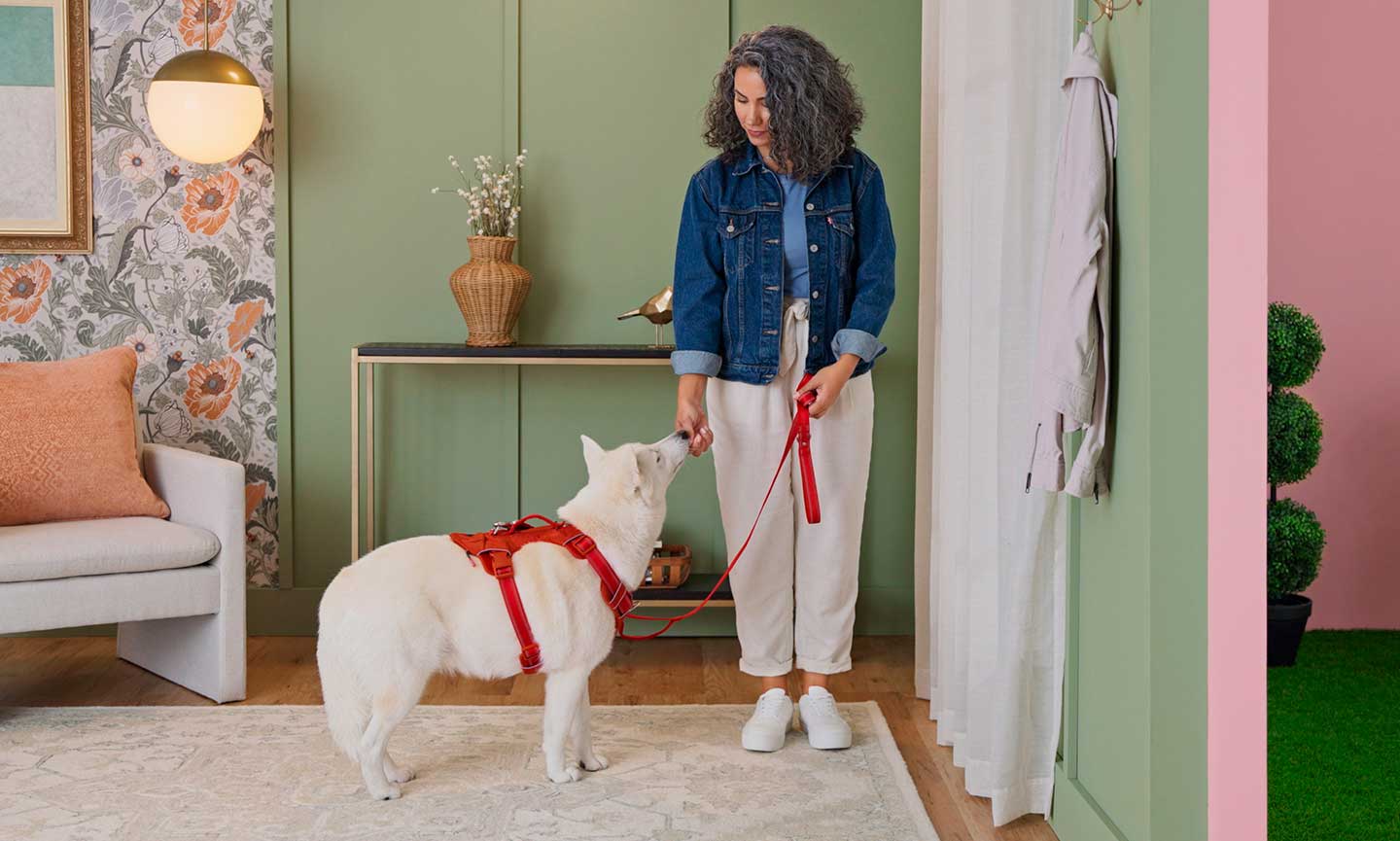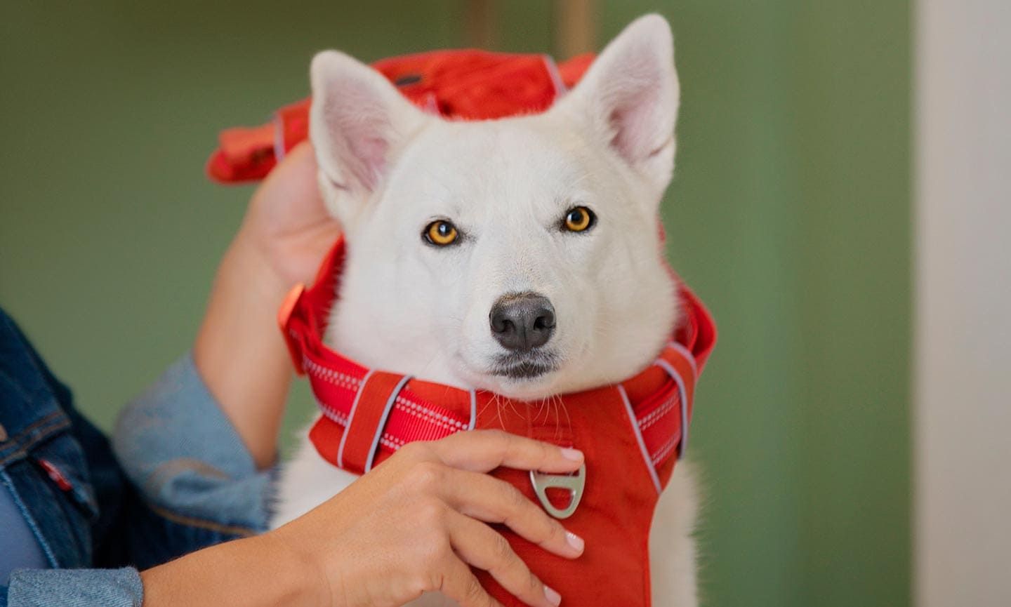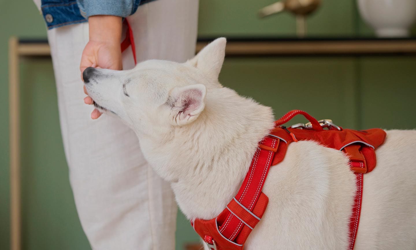 Pro tip: Having trouble getting your dog to wear their harness? Use a treat to lure your dog’s head through the neck hole, and continue feeding treats at each stage of the harnessing process: one when the harness goes on, another when you clip the harness, and a third when you attach the leash.