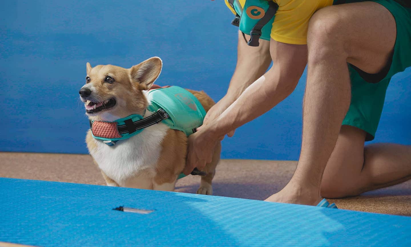 If your dog has trouble getting onto the board by themselves, you can give them a lift using the handle on their life jacket.