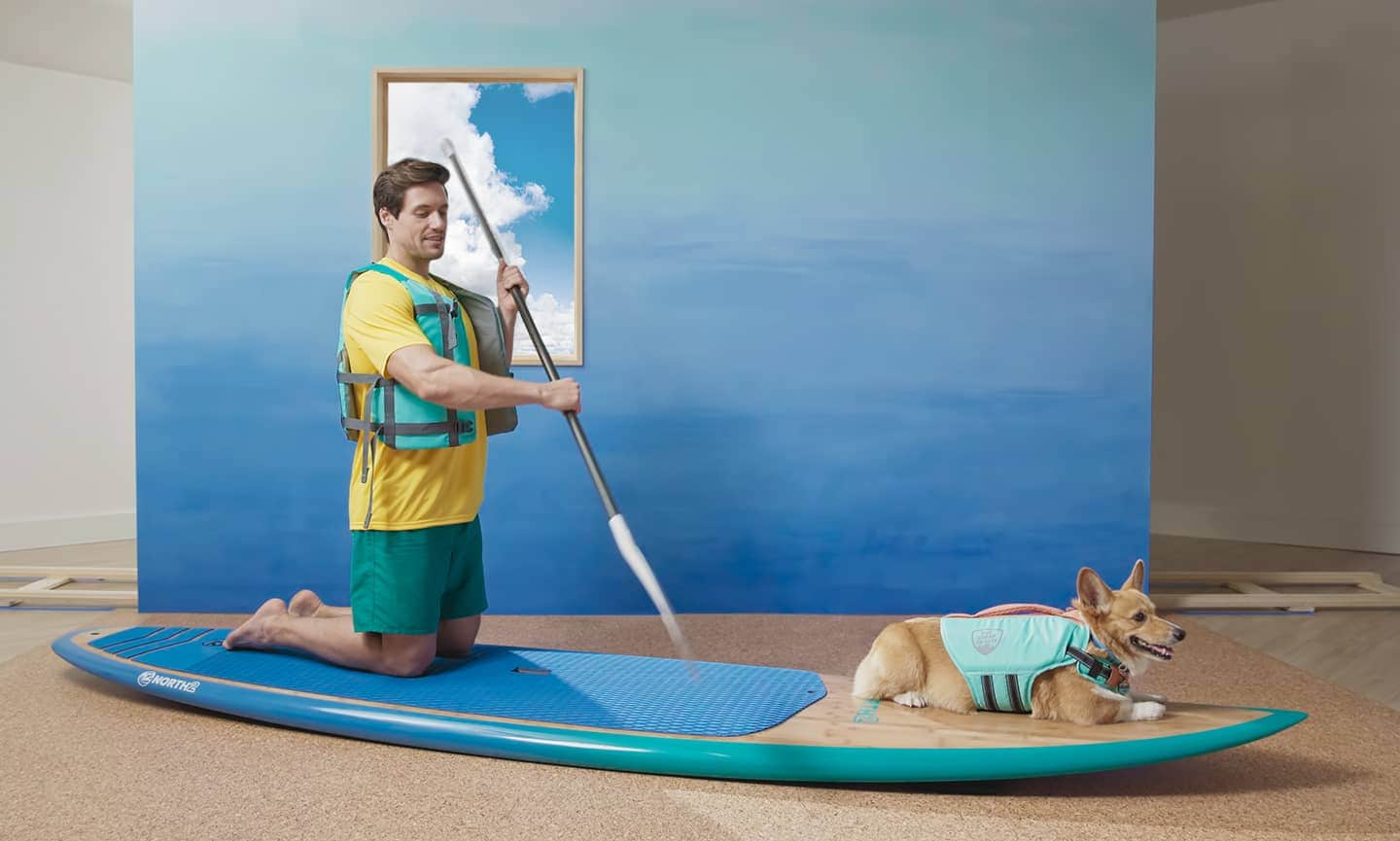 A pro tip from Shipe: Before your paddle board training sessions, take your dog for a walk, to the dog park or give them some vigorous playtime—any type of exercise they typically enjoy.
