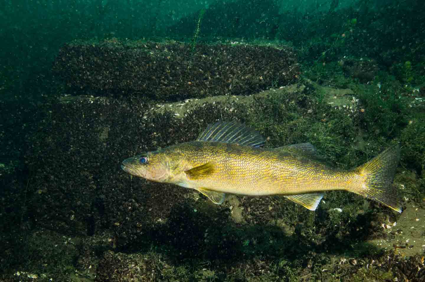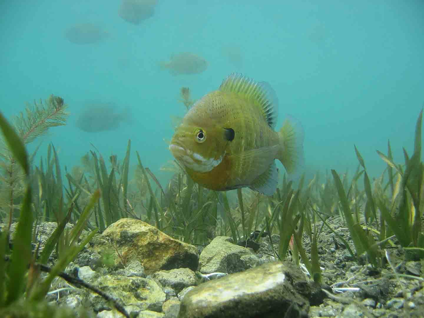 These nocturnal fish are a good fit for very large ponds that offer a combination of deep and shallow areas. As a predatory species, walleye are helpful in controlling populations of smaller fish like minnows or mosquitofish. They’re also known as yellow pike due to their olive/gold coloration. The name walleye, however, is a reference to the pearlescent sheen of their eyes.