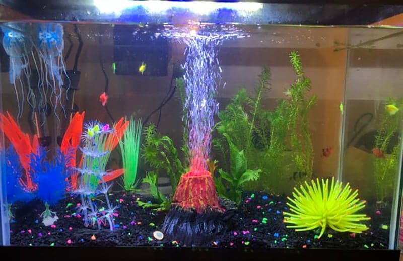 Rawlins says she used all of the items that came from a 20-gallon GloFish starter kit as well as a jellyfish, glow-in-the dark plant and gravel, and a light-up volcano bubbler to make this glow tank come to life. She also added in some live plants to give the fish a place to hide.