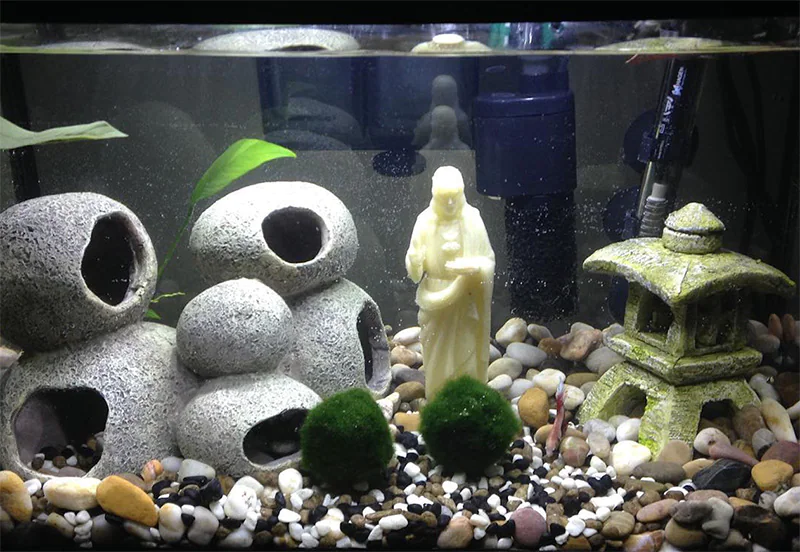 To design a tranquil tank, add in some stone caves, a Buddha, ancient-looking architectural ornaments and some live plants, like the moss balls that are in this setup.