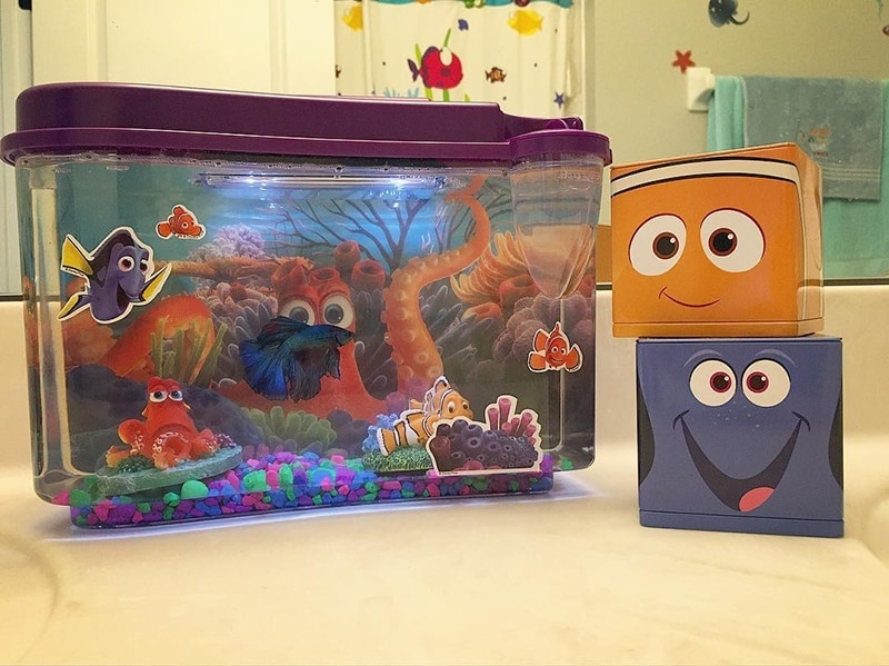 To create a tank similar to this, you’ll need a coral background, brightly colored pebbles, Disney stickers and aquatic ornaments of Nemo, Dory, Hank and any other of your favorite characters from the movies.