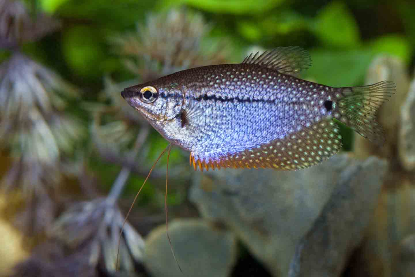 Pygmy gouramis are brown and covered in light blue spots. In the right light, their reflective scales appear to shimmer.