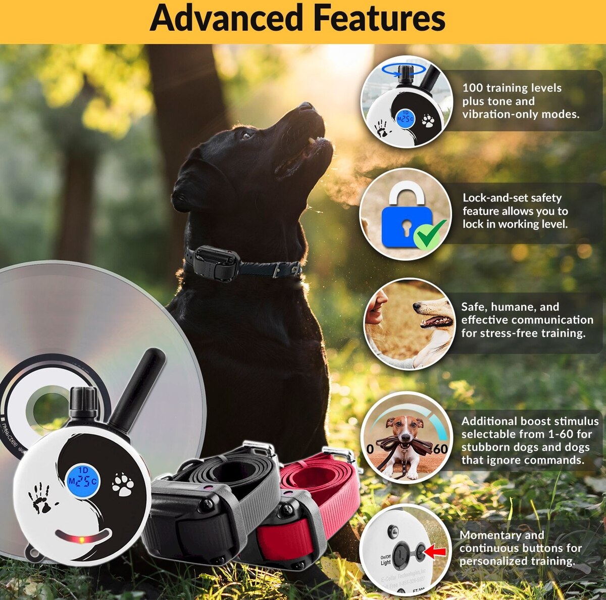 This training collar is loaded with unique features, including ""lock and set"" stimulation levels from 1 to 100 so you can control 2 collars with 1 remote.