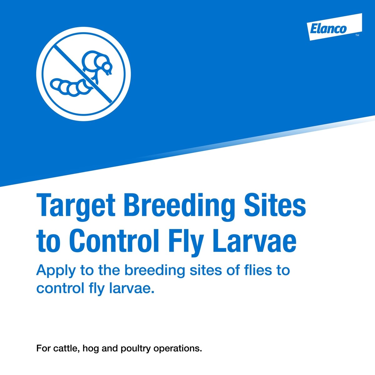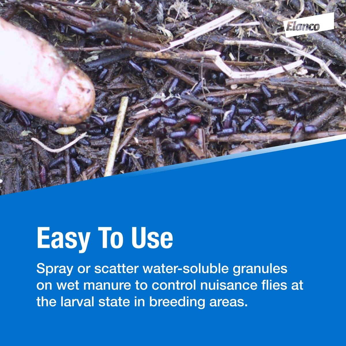 • Easy to use; simply spray or scatter the water-soluble granules on wet manure in breeding areas to control nuisance flies at their larval stage.