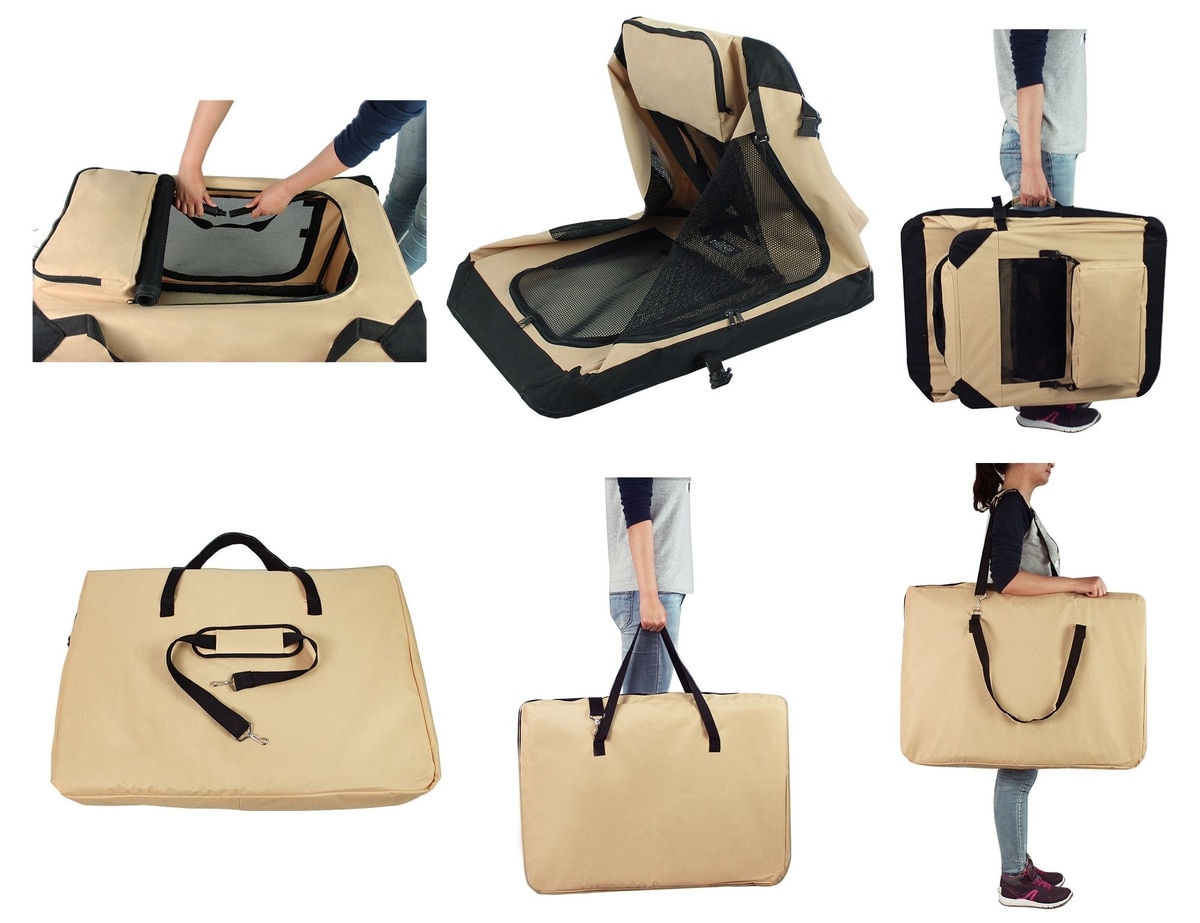 This soft-sided crate is suitable for putting the safety belt through the handle at the bottom of the soft crate.