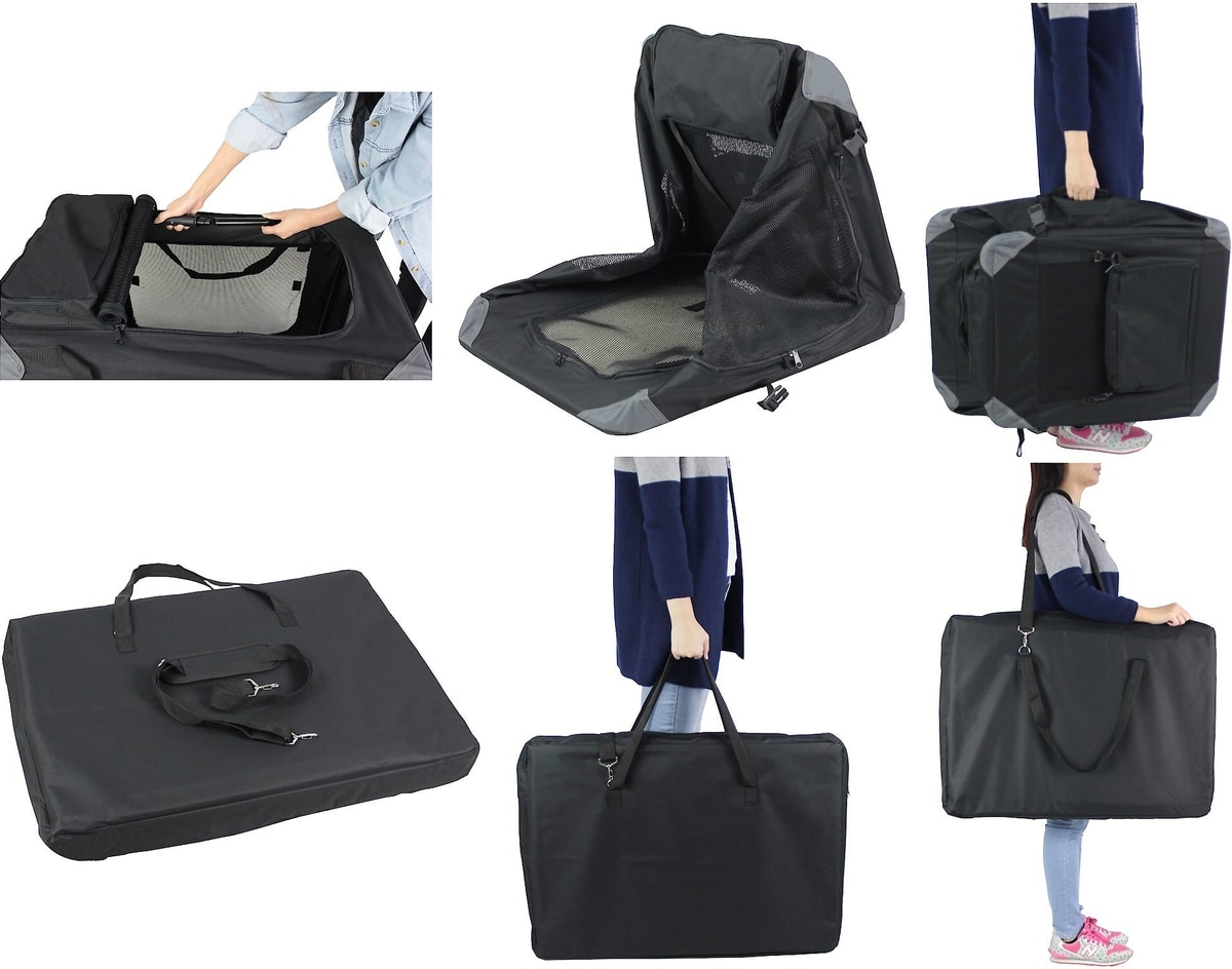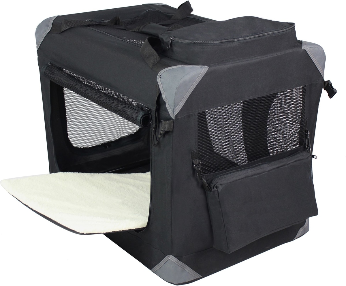 This soft-sided crate is suitable for putting the safety belt through the handle at the bottom of the soft crate.