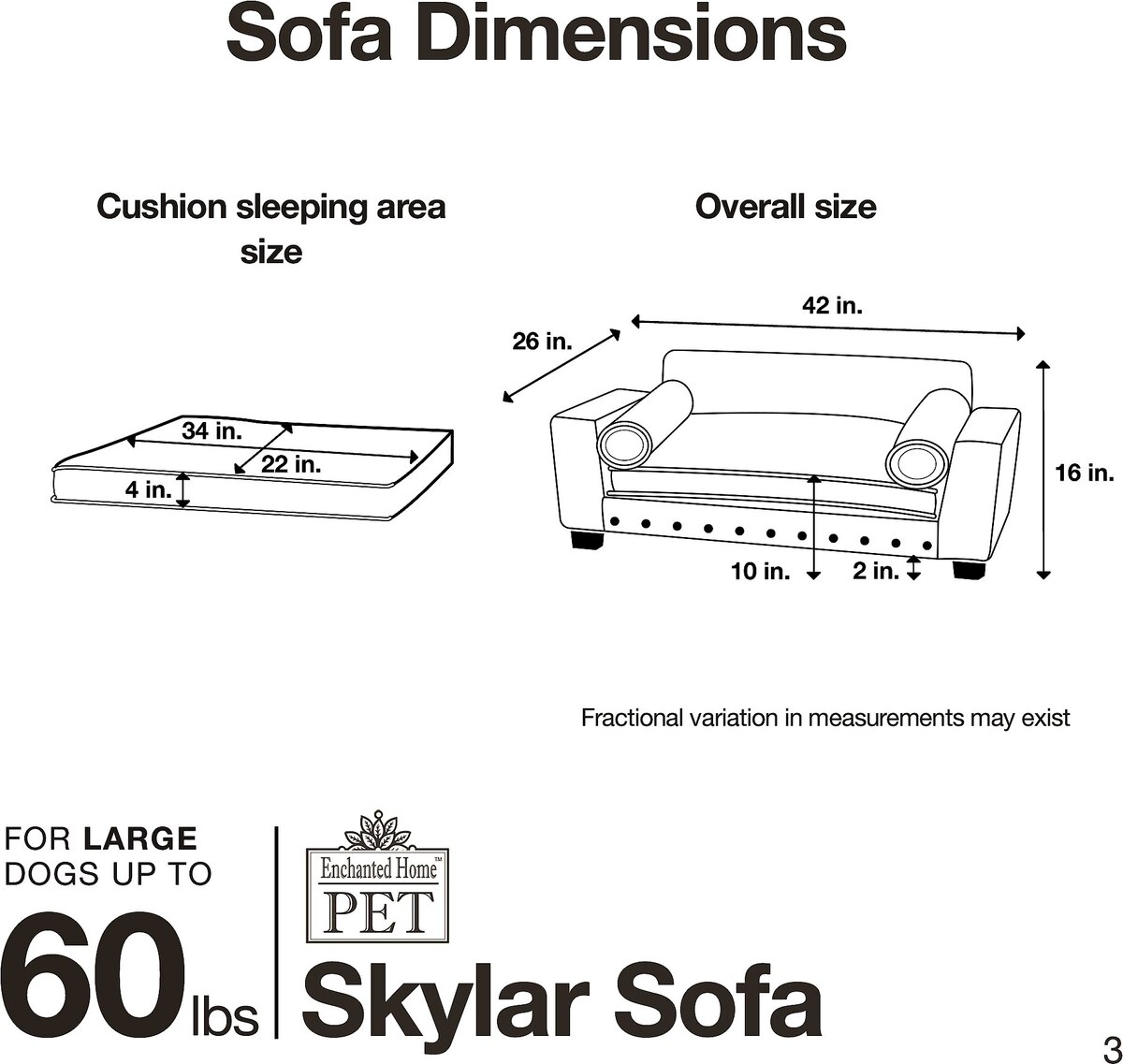 This bed is made to fit dogs up to 60 pounds and measures 42 x 26 x 16 inches. We recommend measuring your pet to ensure a proper fit.