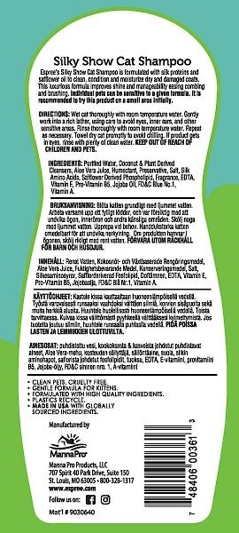 The picture of the back of the bottle showing the ingredients on the site doesn’t read on my phone (it’s just a bunch of blur even zoomed in), so I based my purchase on the ingredients list posted by chewy in the description. This is the product I THOUGHT I was purchasing: Purified Water, Conditioners, Detangler, Aloe Vera Juice, Emulsifier, Dead Sea Mud, Emollient, Fragrance, Chamomile Extract, Sage Extract, Thyme Extract, Yarrow Extract, Mint Balm Extract, Marsh Mallow Extract, Kava Kava Extract, Preservative. The ACTUAL ingredients: Purified water, coconut and plant derived cleansers, humectant, preservative, salt, silk amino acids, safflower derived phospholipid, fragrance, EDTA, vit E, pro-vitamin 5, jojoba oil, fd&c blue no. 1, vitamin a. I don’t really know why it needs dyes in cat shampoo. My 18.5 year old cat is really stinky because he has arthritis and no teeth, thus can’t groom himself very well (though he tries!). I just wanted to give him a really nice bath to freshen him up, and what I thought I was getting would be some ingredients that would be really soothing to his super senior little body, and safe to use. There is a big difference between the two lists, and what is in the bottle smells processed and chemically. I wouldn’t feel comfortable using this on my super senior cat (18.5 human years means he’s about 90 in cat years).