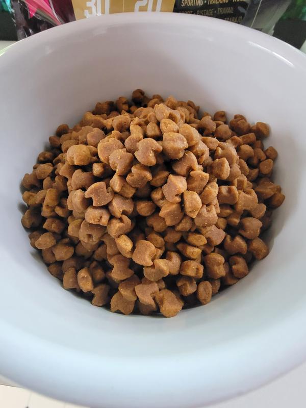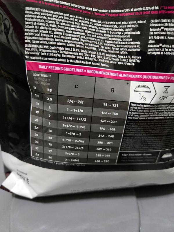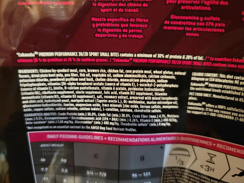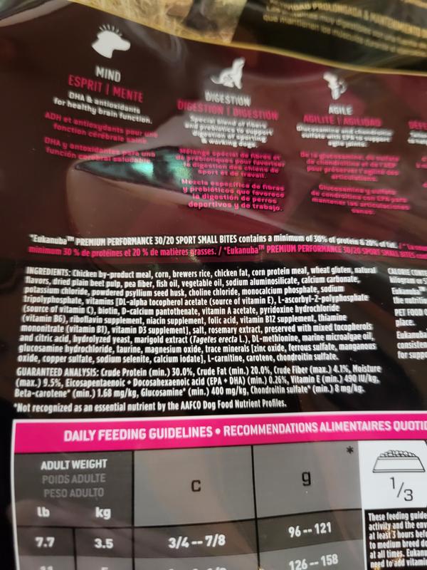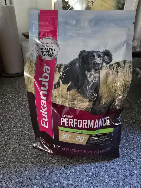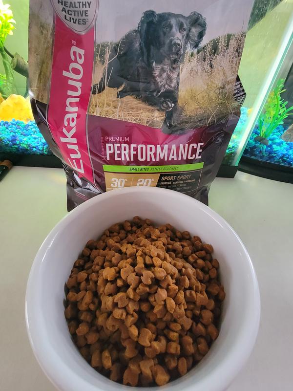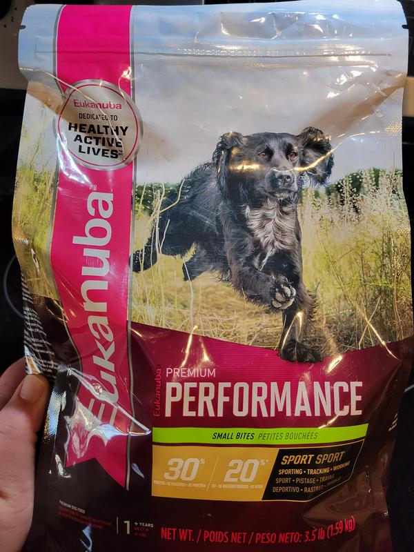 Eukanuba Premium Performance 30/20 Sport Small Bites are made for sporting, tracking, and working smaller-breed dogs. Premium Performance 26/16 Exercise Small Bites are ideal for smaller dogs doing activities like running, hiking, and assistance.