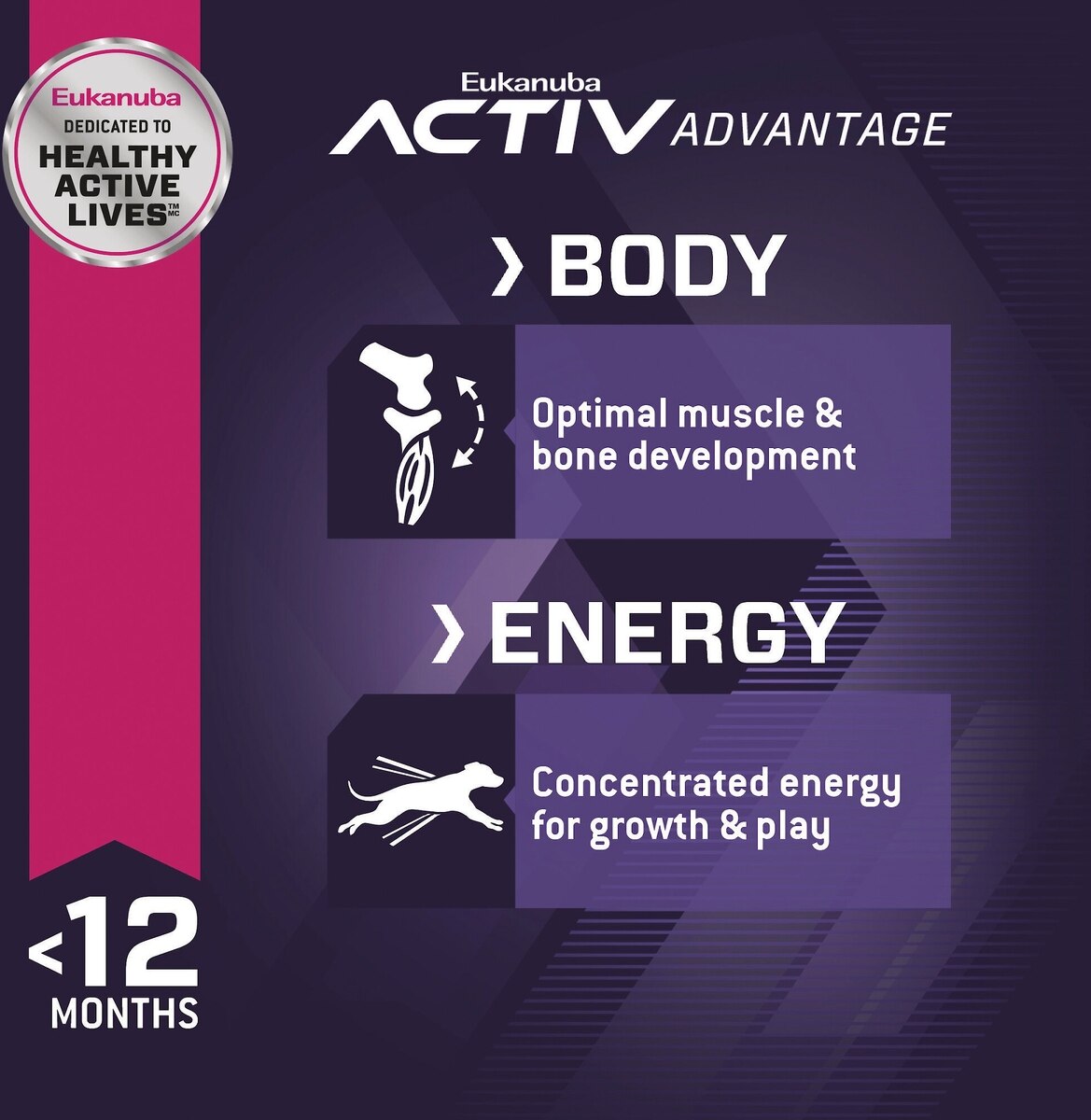 Animal protein plus optimized levels of calcium and phosphorous support muscle growth and bone health in active pups.
