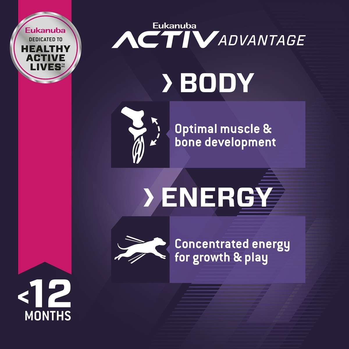 Animal protein plus optimized levels of calcium and phosphorous support muscle growth and bone health in active pups.