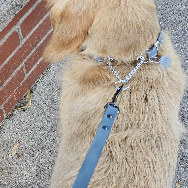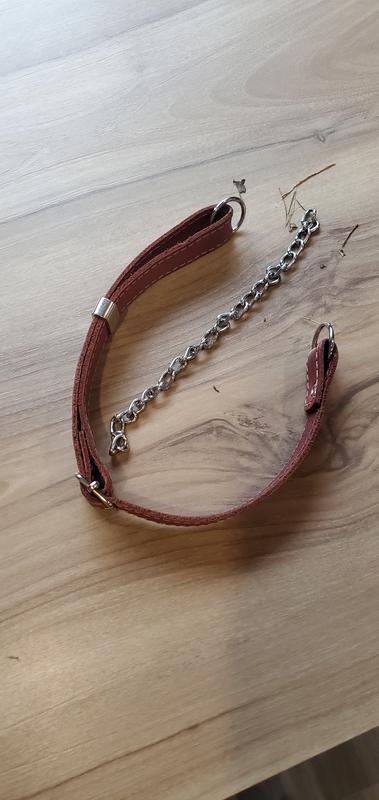 His last Martingale collar lost a clip which made the collar slip over his head. This collar is leather and steel so it keeps its position and tightens as necessary