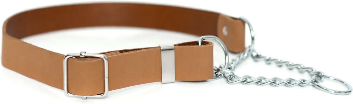 The leather with the chain for loose but safe walking is awesome. We like it much better than full chain choke/training collar