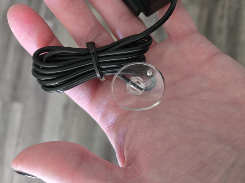 I like that this has a suction cup as opposed to glue to affix to the outside of the enclosure, and the probe fits perfectly into the small hole on top edge of the
