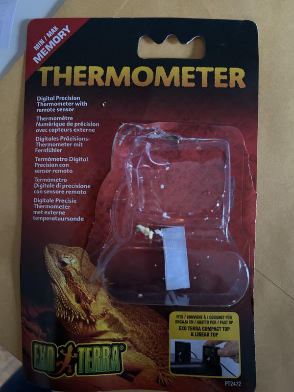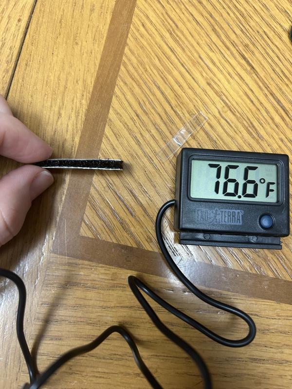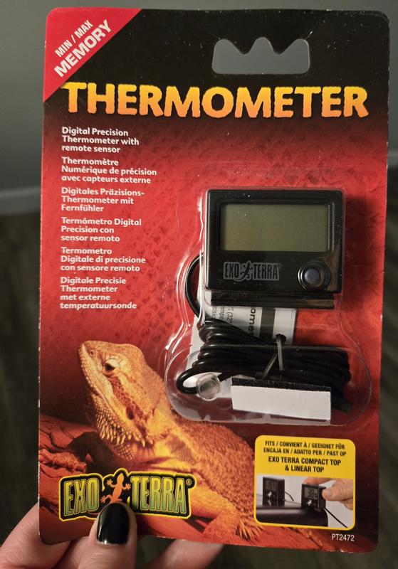 This Exo Terra digital thermometer is sleek and simple to use. It came with a battery and a clearly marked switch on the back to change between Fahrenheit and Celsius. I like the removable slide-mounting clip so it can be attached to the top of an Exo Terra enclosure lid. I don’t have an Exo Terra enclosure for my reptile, but I think it’s a very efficient way to mount the instrument with maximum visibility. Since I don’t have a different brand of enclosure it’s nice that they also include a hook and loop fastener. And most importantly it seems to be measuring the temperature accurately. I compared it to two other digital thermometer that I have had for a while now and this one consistently reads in the middle of the two other brands (see photos).