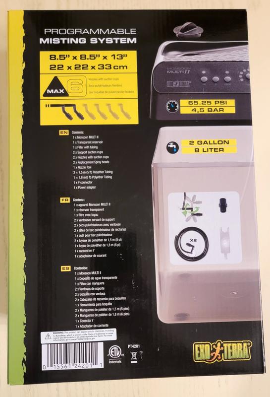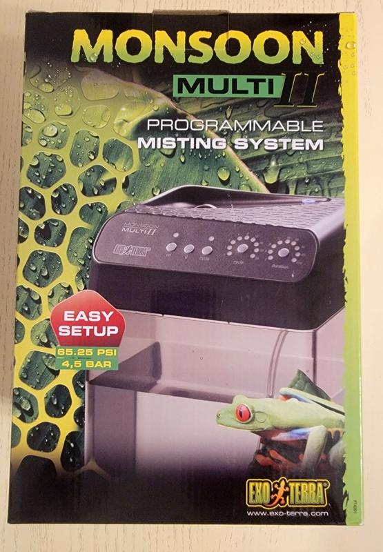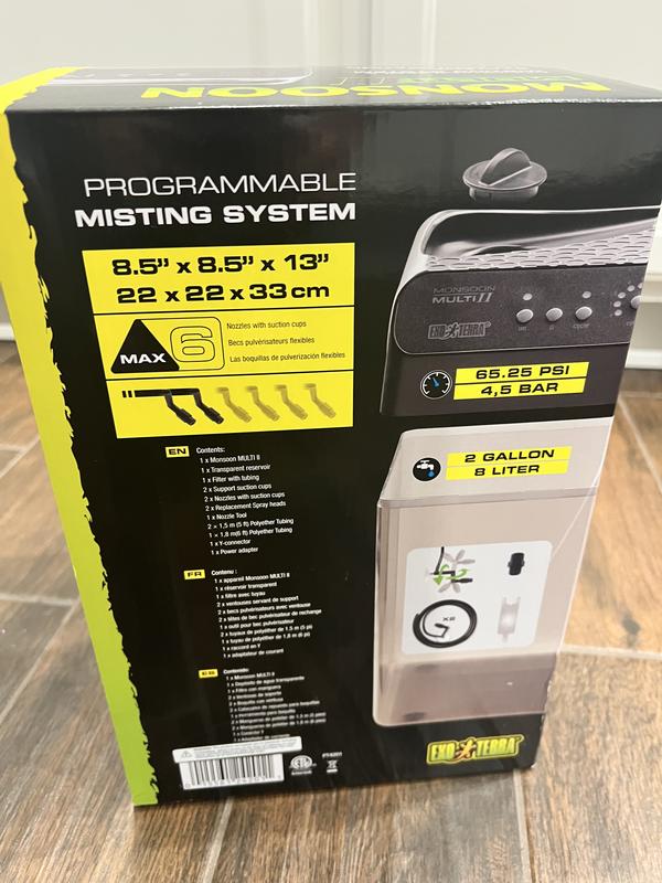 The Exo Terra Monsoon Multi II is a great addition to keep perfect humidity in all my enclosures.With the multiple nozzles and long hosing it allows me to easily