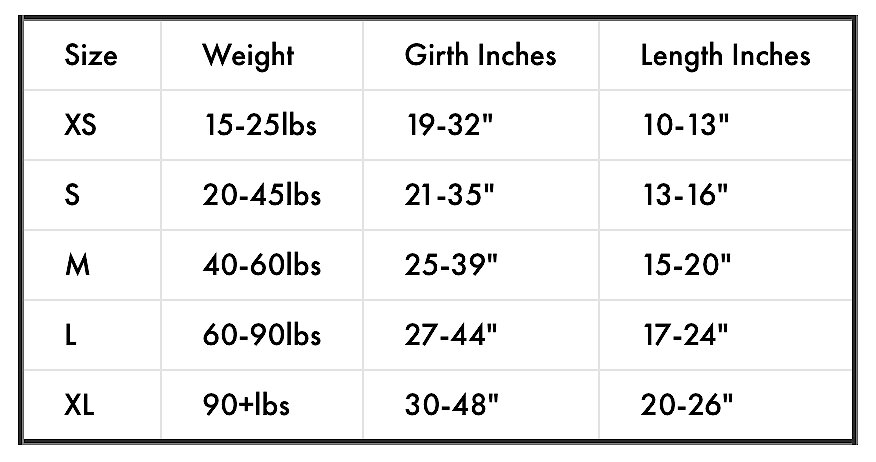 The weights listed in the sizing chart are general and may vary since dogs can carry their weight differently. The measurements of their girth and length will be the main factors in determining the best size for your individual dog.