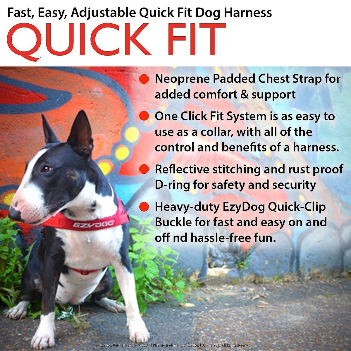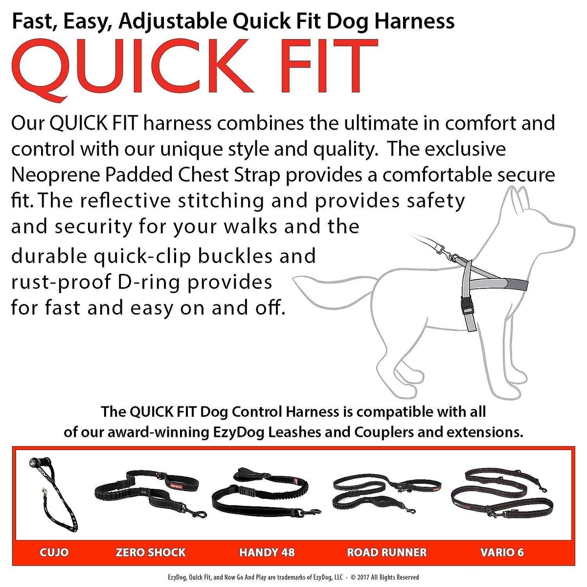 • The QuickFit dog harness is designed to minimize pinching or chafing with a neoprene chest strap for extra comfort