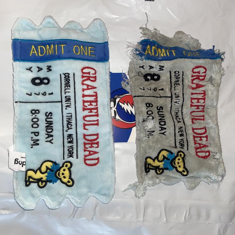This was a very fun find. The tickets to a real dead show that took place at Cornell University in 1977. The set list is fabulous.! If you have a dog that chooses up toys this is probably not the one for you. Or a lab is gentle with all of his toys so I was not concerned when ordering it. It is well-made for a plush soft toy. It does not appear to have stuffing in it, but it does have squeakers. We love it! Love Not Fade Away.