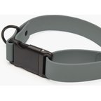This collar has a D-ring and can be attached to any traditional leash clip hardware. Depending on the type of tie out used, this collar may or may not be compatible.