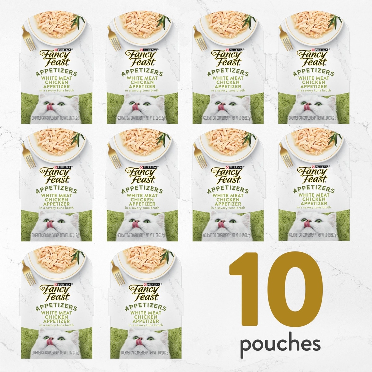 - Fancy Feast Appetizers Grain-Free White Meat Chicken & Flaked Tuna Appetizer in Savory Broth Wet Cat Food, 1.1-oz tray, case of 10$11.76 Chewy Price$13.50 List Price$11.17 Autoship PricePromo, New Customers Only: Spend $49+, Get $20 eGift Card +1 deal