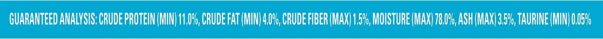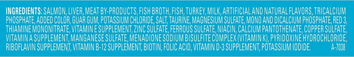 Salmon, Liver, Meat By-Products, Fish Broth, Fish, Turkey, Milk, Artificial and Natural Flavors, Tricalcium Phosphate, Added Color, Guar Gum, Potassium Chloride, Salt, Taurine, Magnesium Sulfate, Mono and Dicalcium Phosphate, Red 3, Thiamine Mononitrate, Vitamin E Supplement, Zinc Sulfate, Ferrous Sulfate, Niacin, Calcium Pantothenate, Copper Sulfate, Vitamin A Supplement, Manganese Sulfate, Menadione Sodium Bisulfite Complex (Vitamin K), Pyridoxine Hydrochloride, Riboflavin Supplement, Vitamin B-12 Supplement, Biotin, Folic Acid, Vitamin D-3 Supplement, Potassium Iodide. A-7038.