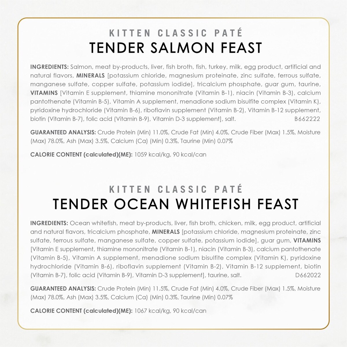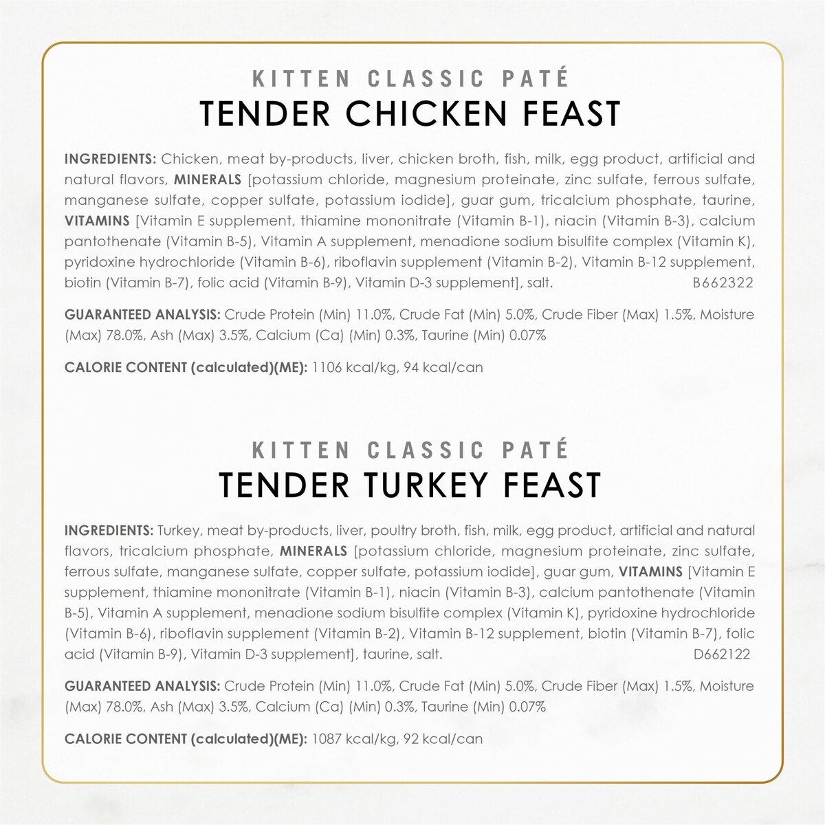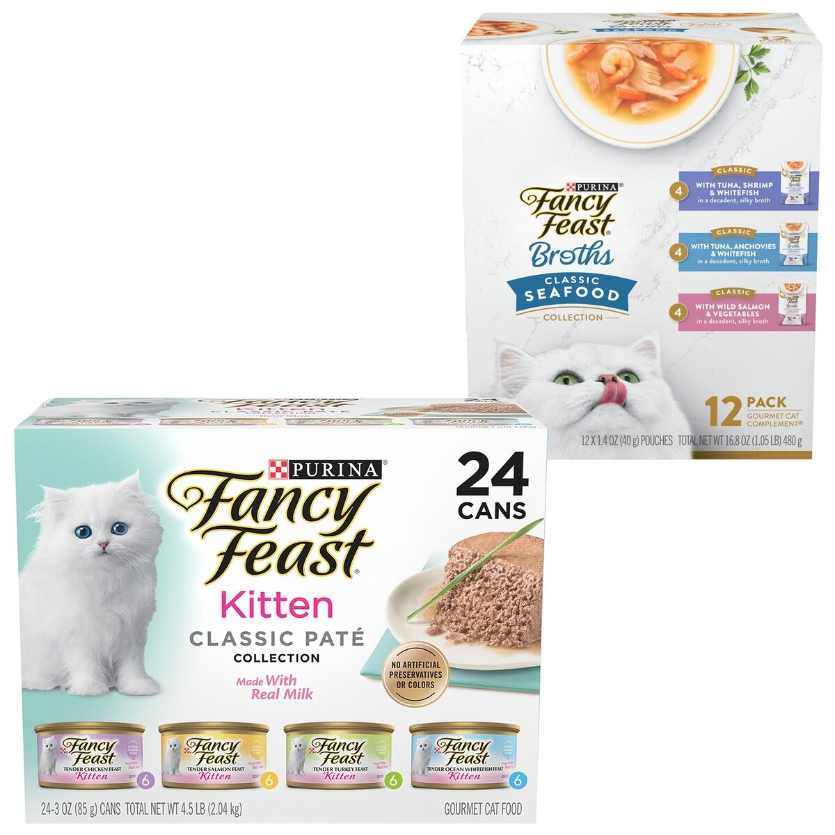 Bundle: Fancy Feast Tender Feast Variety Pack Canned Kitten Food + Classic Collection Broths Variety Pack Complement Wet Cat Food