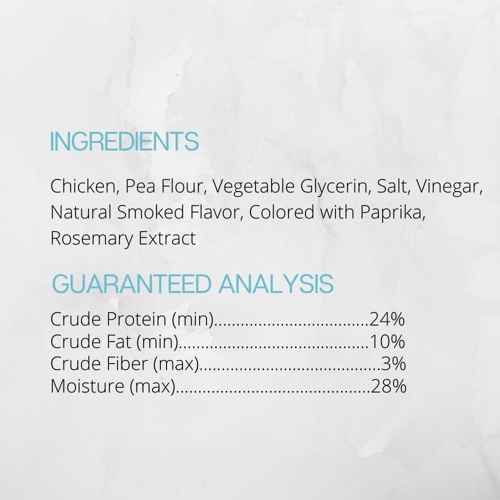 Chicken, Pea Flour, Vegetable Glycerin, Salt, Vinegar, Natural Smoke Flavor, Colored with Paprika, Rosemary Extract.