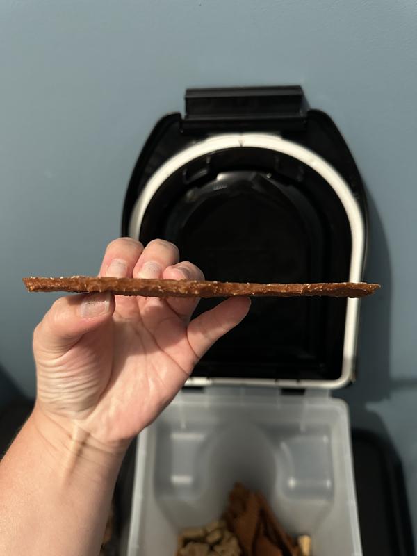 These are wonderful treats! Thin, large, chewy, and clean ingredients. They smell good. They break easily without falling apart. Dog loved them. And there are a