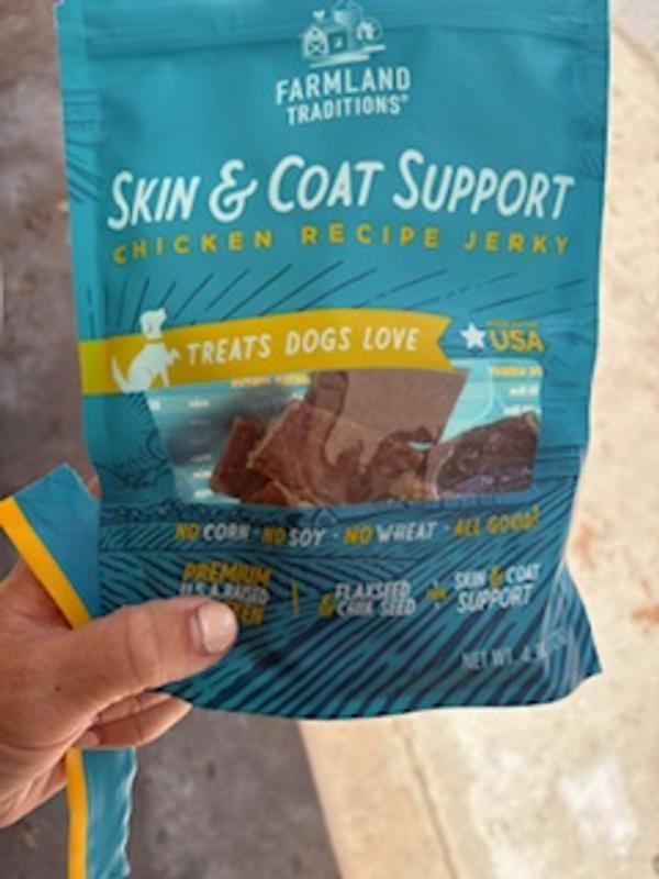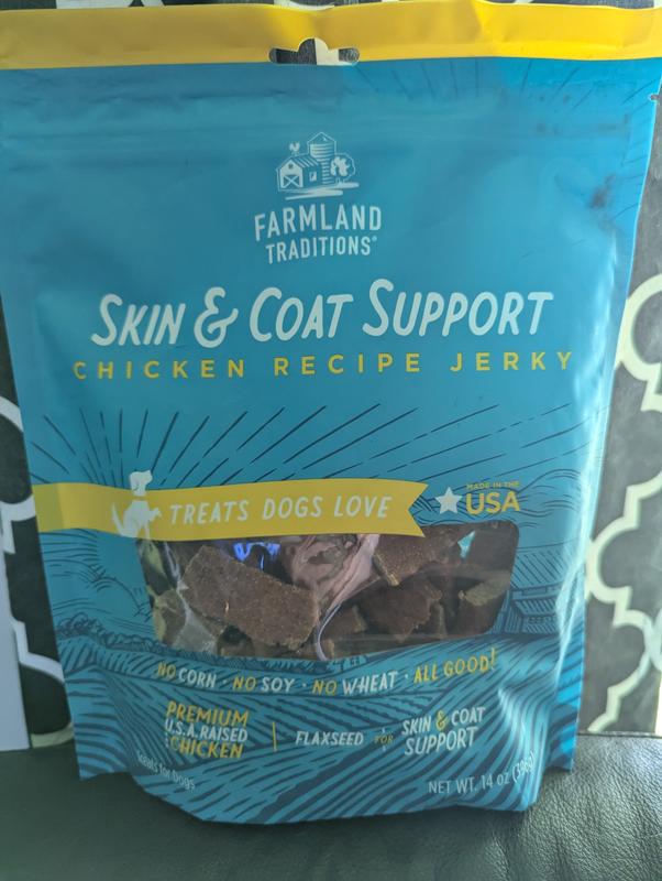 Farmland Traditions Skin & Coat Support - Chicken Recipe Jerky are Treats for Dogs in a 4.3oz package. Jerky treats are made in U.S. facilities using USA raised