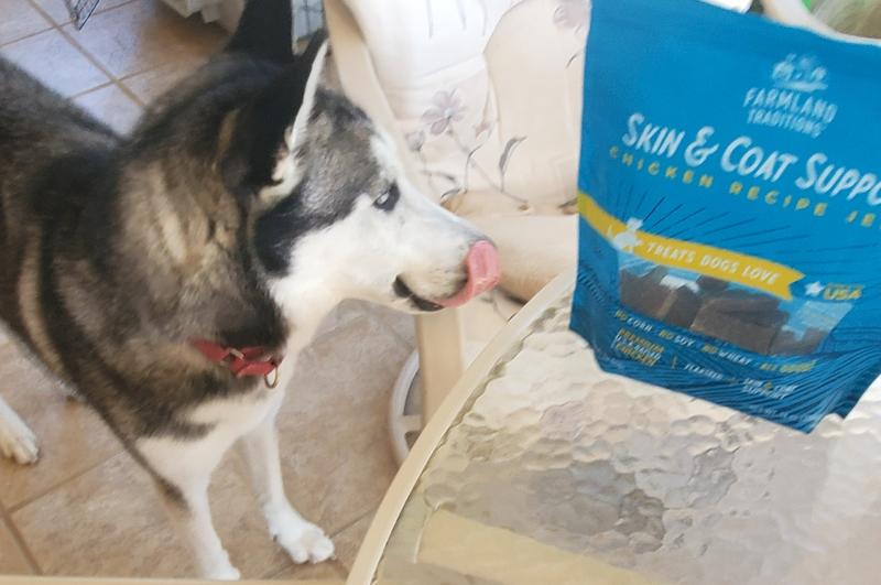 Farmland Traditions Skin & Coat Support - Chicken Recipe Jerky are Treats for Dogs in a 4.3oz package. Jerky treats are made in U.S. facilities using USA raised chicken. Product is created with flaxseed and chia to help maintain a health skin and coat. Recipe chicken, pea flour, vegetable glycerin, salt, vinegar, natural smoke flavor, ground whole flaxseed, ground whole chia seed, and rosemary extract. Product promotes no corn, wheat or soy for improved palatability. Crude Protein -min. 22% Crude Fat -min8% Crude Fiber -max3% Moisture -max 28% Omega-6 fatty acid -min 0.5% Omega 3 fatty acid -min 0.5% Calorie Content: ME = 30 kcal per piece My Labrador ate the treats. Palatability was acceptable. I did not notice any changes in skin and coat after utilizing the treat through the first bag. We gave her 2-3 treats as recommended on the bag. Treats were used as supplemental feeding alongside her maintenance food.