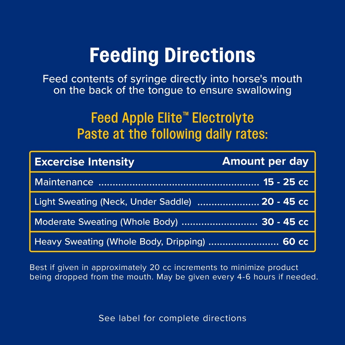 Apple Elite Electrolytes are available in 5 lb. and 20 lb. powder, 60 cc paste, and 7.5 lb. pellets for various horse needs and preferences.