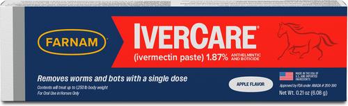 Broad Spectrum Control Farnam IverCare (ivermectin paste) 1.87% provides effective treatment and control against equine parasites, including large and small strongyles, pinworms, ascarids, hairworms, large-mouth stomach worms, bots, lungworms and intestinal threadworms.