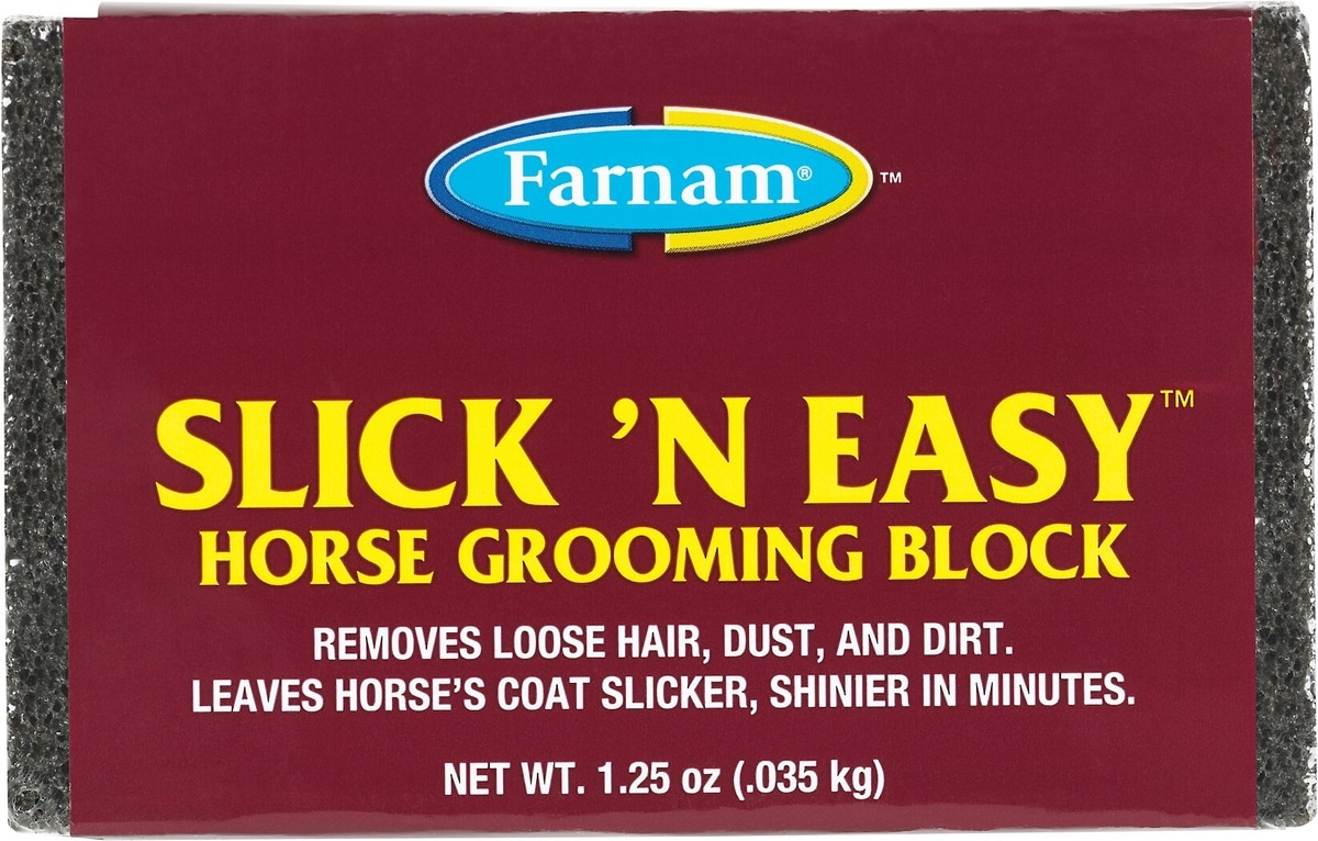 Slicker, Shinier Hair in Minutes Transform your horse’s coat in minutes with the Farnam Slick 'N Easy Horse Grooming Block. This simple yet effective tool removes loose hair and gently sweeps away top and undercoat fibers — leaving your horse looking slicker and shinier.