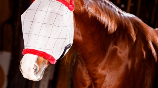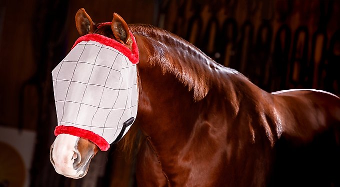 Protection That Stays On The masks feature a double-latch closure under the jaw so stablemates can’t rip it off. Protecting against sunlight as well as dust, dirt, and debris that can cause eye injury, they’re available in a variety of sizes, both with and without mesh ears.