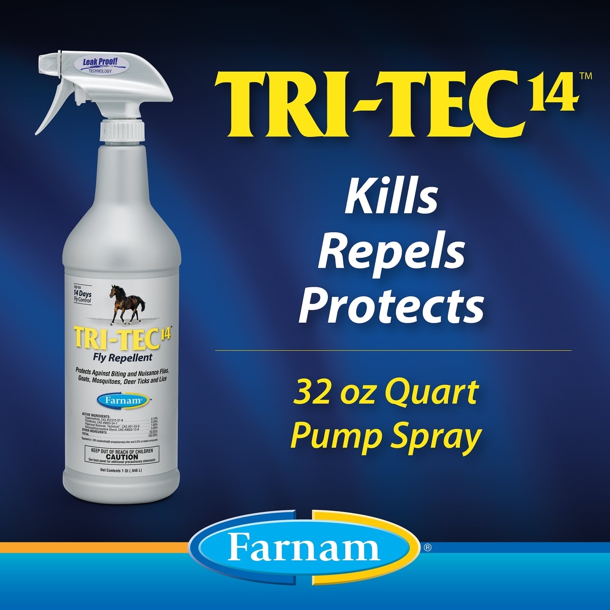Enjoy bug-free peace of mind with quick knockdown of flies. Tri-Tec 14 Fly Repellent helps you protect hardworking horses from flies, gnats, mosquitoes, lice, ticks, and deer ticks that may transmit Lyme disease. One application of this triple-action fly spray lets you kill and repel flies to protect your horse for up to 14 days, even through sweat and moist conditions.
