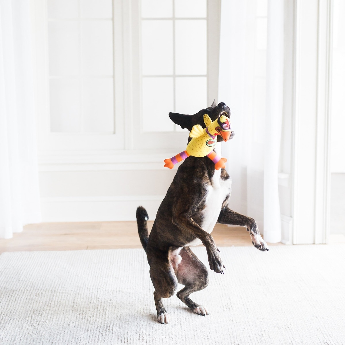 Bright and colorful, quirky and provides lots of entertainment for my kids. The legs are definitely taking a beating as my Duke loves to chew and tear things up but it’s lasted longer than most toys I’ve given him so we’re happy. My former dachshund Carmen has 2 of these so once I saw this toy on Chewy I had to get it for my current dogs. They love this toy, just look at that wittle face.