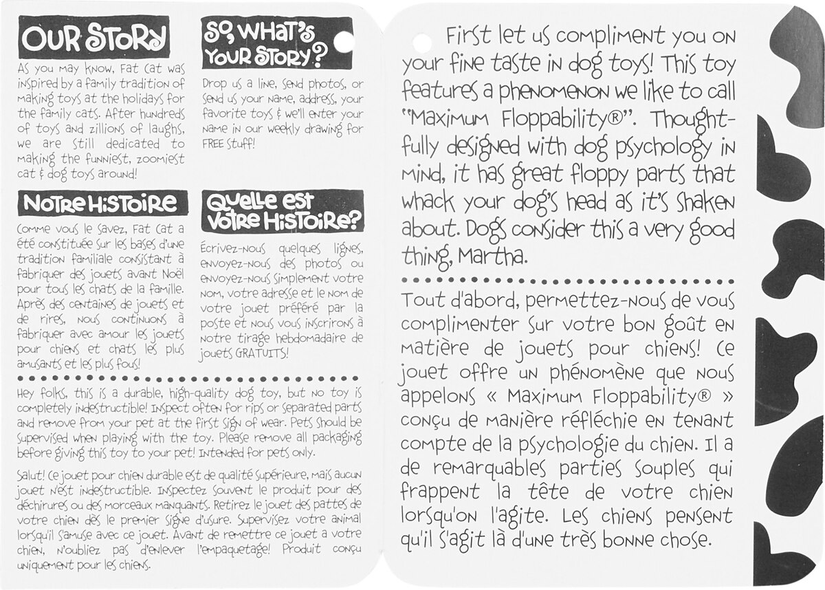 I have several different Fat Cat toys which my dog loves. She enjoys fetching, shaking the flappy arms and tugging them. They have endured intensive chewing with just teeth marks but no tearing or lost limbs. They are good indoors or outside and wash well.