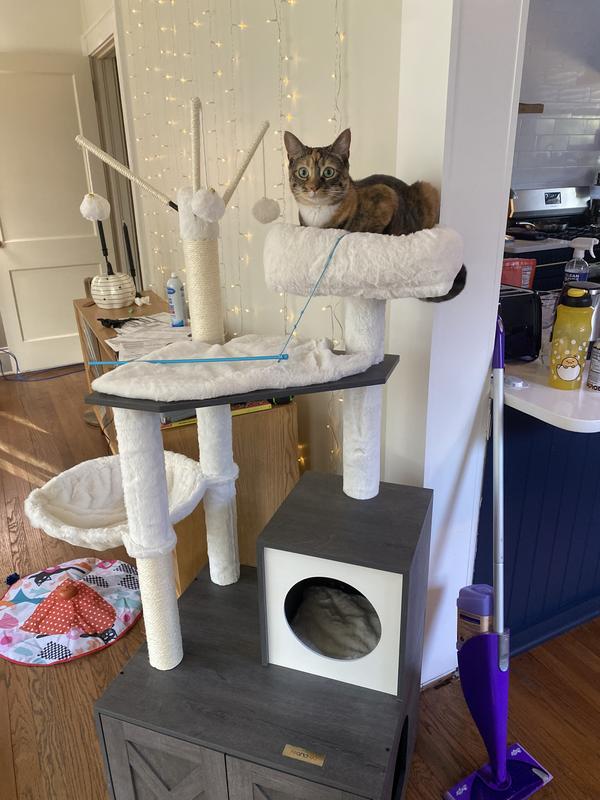 - The multifunctional design offers a space-saving solution for playing, snoozing, scratching, and answering nature’s call.