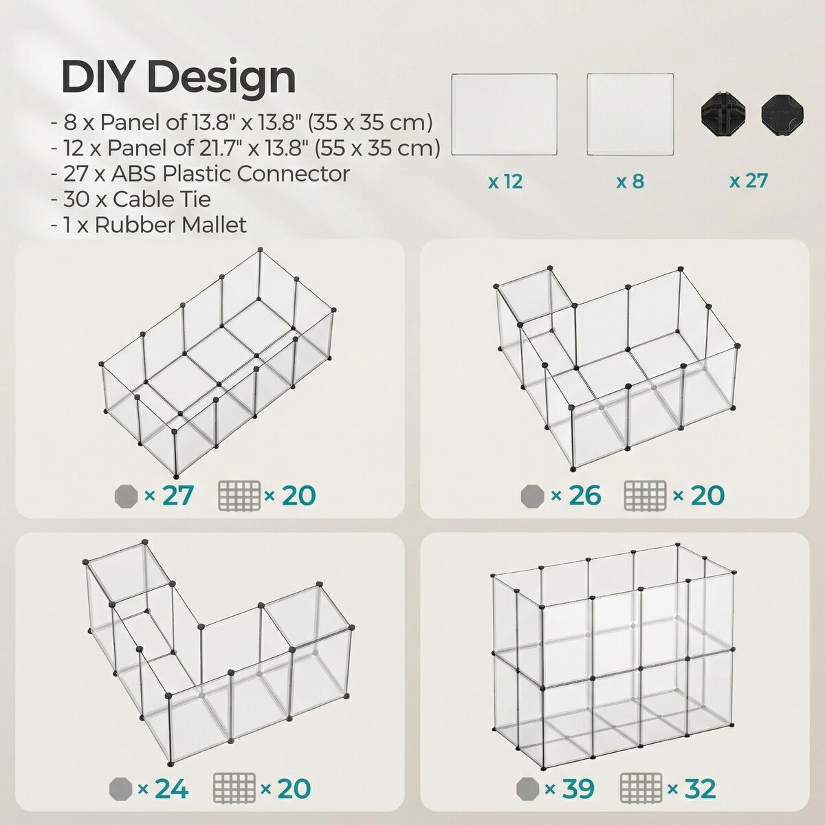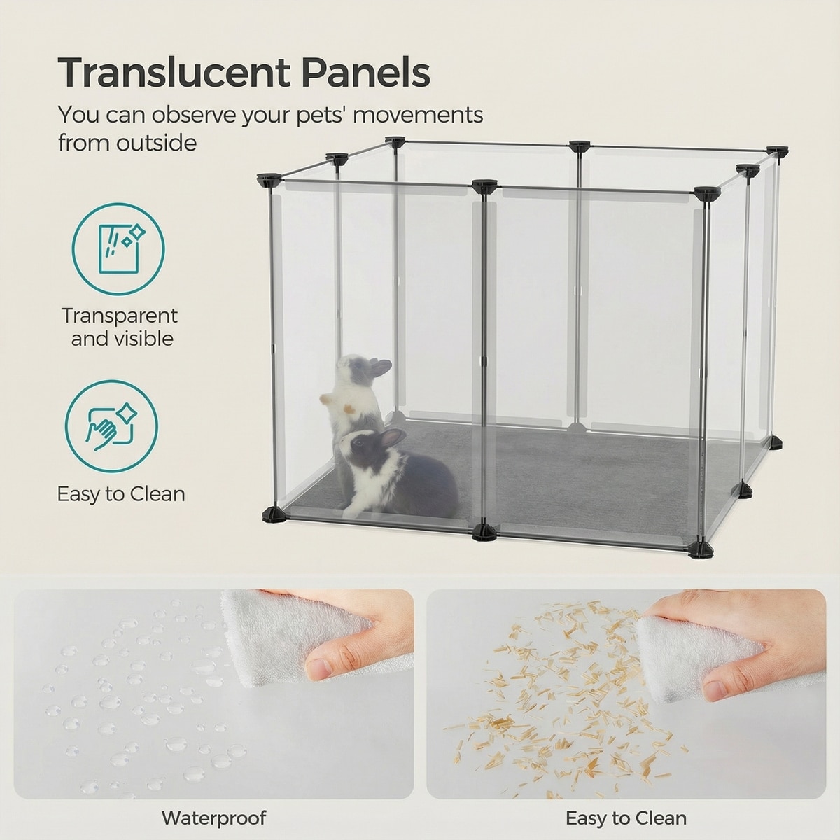 To prevent pets from chewing or biting, install the plastic panels with the sides featuring the seams facing downwards or outwards. To prevent pet droppings or debris from leaking and soiling the floor, we recommend placing a pee mat at the bottom of the enclosure during use. Despite the gapless corner design, it’s suggested to add a mat around the base and cover the joints to leave no chance for avid chewers to escape. The pen is intended for small pets only, it is not recommended for larger animals, such as adult dogs or cats. During assembly, please make sure the corners of the panels are inserted into the bottom of the connectors entirely to add security. Connect two panels to the structure side by side with 2 cable ties. Please do not use it outdoors for extended periods of time.